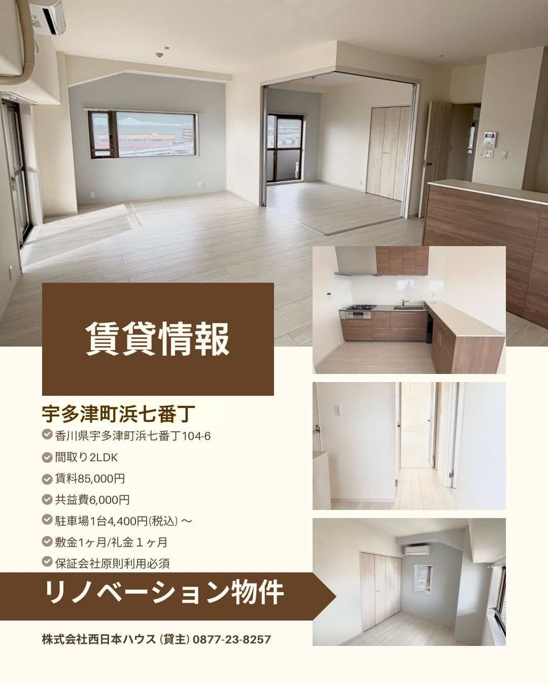 株式会社西日本ハウスはお客様の納得のいく住まい探しをモットーに、注文住宅・建築・設計・リフォーム事業等を行っております。また、丸亀市、坂出市、宇多津町などを中心エリアとした自社管理不動産賃貸や不動産売買等のご紹介を行っております。お客様からお喜びの声をいただけるよう日々精進してまいりますので住まいづくり、不動産のことならどうぞお気軽にご相談下さい。